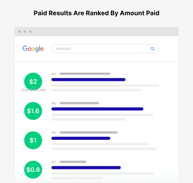 付费广告完全独立于有机列表。付费结果板块中的广告商是按照他们愿意为特定搜索结果中的一个访客支付多少费用来 "排名 "的(称为 "按点击付费广告")。