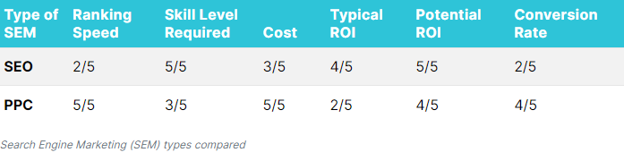 简而言之,搜索引擎优化侧重于通过网站优化从有机搜索结果中获取流量。另一方面,SEM 结合了搜索引擎优化和付费搜索营销(特别是 PPC),从搜索引擎中获取流量。
