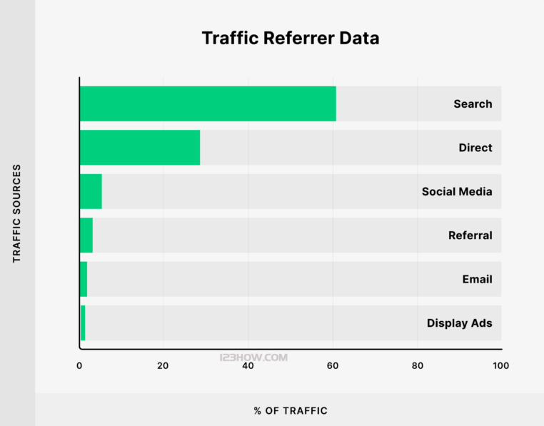 正如你所看到的,超过60%的网络流量来自像Google、Bing、Yahoo和YouTube这样的搜索引擎。搜索带来的流量是社交媒体的10倍。