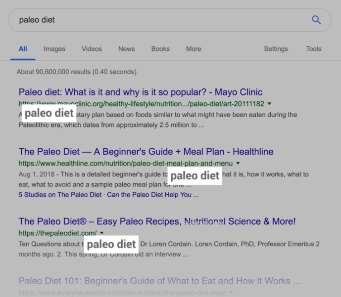 你点击的第一个结果(“结果A”)是由全球最著名的Paleo专家撰写的。因为该页面上有大量高质量的内容,很多人都链接到了它。